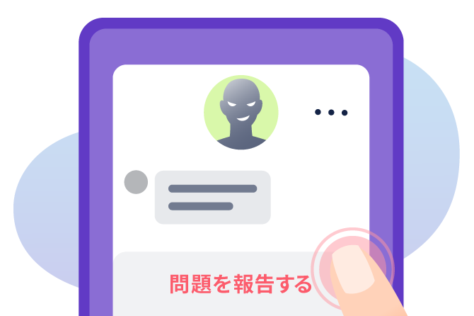 不快な体験や不審な相手を発見した時、誰でもすぐに「報告」機能にて、運営に知らせることができます。報告したことが、相手に通知されることはありません。