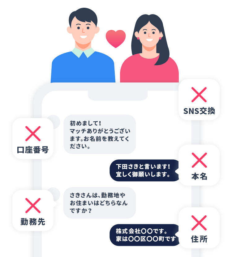 マッチングアプリ協会加盟企業※は入念なプロフィール審査や24時間365日のパトロールなど安心・安全なサービス運営を心がけていますが、 新しい出会いの場で直接会ったことのない方とマッチングする際はご自身でも自分を守る知識が必要です。 トラブルにあわないために以下に注意して素敵な出会いを見つけましょう。